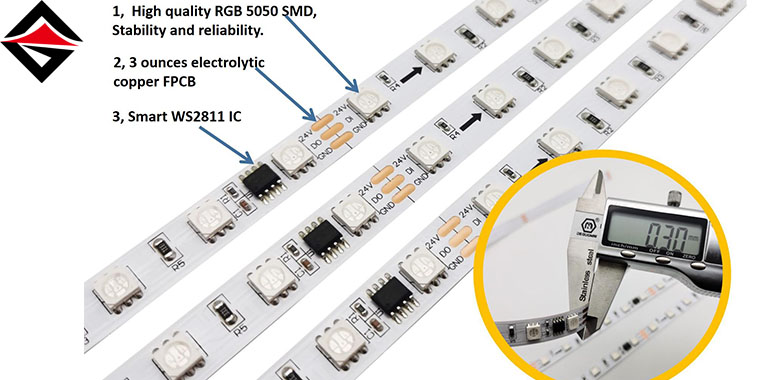बहने वाली हल्की पट्टी आमतौर पर तीन प्राथमिक रंग एलईडी लैंप मोतियों, लाल, हरे और नीले रंग का उपयोग करती है, जो विभिन्न प्रकार के रंगों को मिला सकती है। उच्च-अंत मॉडल पूर्ण रंग स्वतंत्र संबोधन का समर्थन करते हैं, प्रत्येक एलईडी आरजीबी मूल्य को अलग से सेट कर सकता है, जिसमें लगभग 16 मिलियन रंग प्रदर्शित होते हैं।